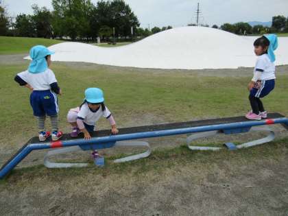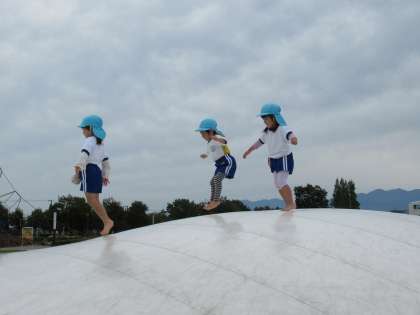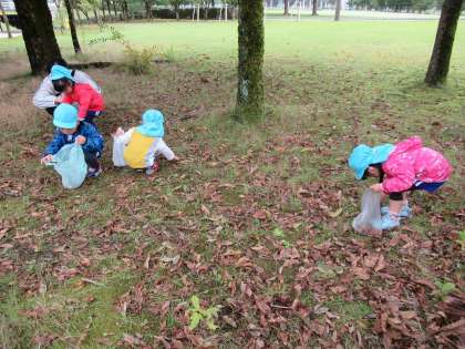 秋の遠足に行ってきました(ほし組) 公開日 2020/10/09 更新日 2020/10/09 1日の生活 10月9日(金) 初めて遠足に出かける子供たちは朝からドキドキしている様子も見られましたが、沢山落ちているどんぐりを見て、嬉しそうに「見て!帽子付いてる」「赤ちゃんどんぐりがあった!」「こっちは双子だよ!」と嬉しそうに自分で見付けたどんぐりを見せてくれました。ふわふわドームでは友達や先生の名前を呼んで一緒に跳んだり、走ったりする子もいて飛び切りの笑顔で遊んでいましたよ!