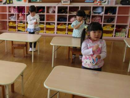 今日はみんなで色々な曲に合わせて鈴を鳴らして遊びました。「さんぽ」がかかると、歌を口ずさむ子や、体を揺らして音楽を楽しむ子もいました。また、月刊誌の付録で付いていたサンドイッチやドーナツもつくりました。みんなで楽しく食べたら美味しかったね!