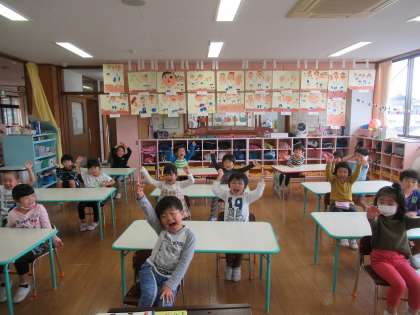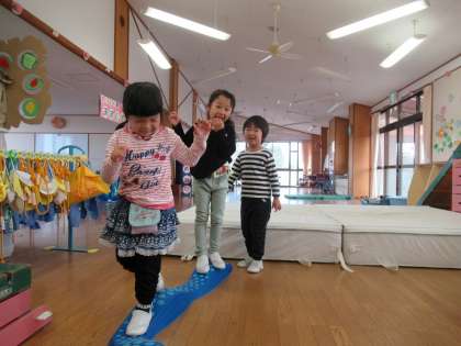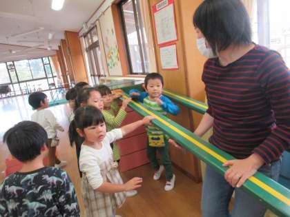 遠足が終わり「遠足楽しかったよね」「また行きたいよね」と話していました。「みんなの運動公園つくろうか」と話すと「やった!」「やりたい」と大盛り上がり。みんなでどんな遊び場があったのか、何をして遊んだのかを思い出しながら話し合い、遊び場の設計図を描きながらイメージしていきました。話し合いが終わると、すぐに動き出した子供たち。「こっち手伝って」「平均台、重たいね」と話しながら準備していきました。遊び場ができるとすぐに遊び出し、平均台やはしご渡り、ジャンプ台等に挑戦していました。明日は、みんなで遊び場の名前を決める予定です。