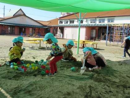 今日は晴れていたのでなかよし広場で砂遊びをしました。大きな穴をみんなで協力して掘ったり、ケーキ屋さんやアイスクリーム屋さんになったりして遊びました。久しぶりに外で遊べて気持ち良さそうでしたよ。