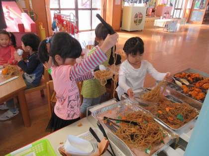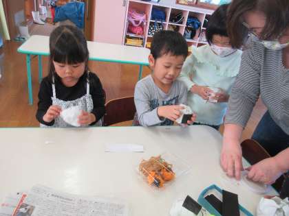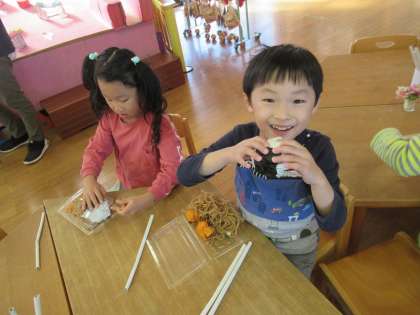 そして、今日はおにぎり屋さんが登場!「シャケのおにぎり」「私は梅干し」「たらこにしたよ」と好きな具材を決めてつくっていました。つくったものをやきそばやたこやきと一緒にお弁当のパックに入れ、友達と一緒に食べることを楽しんでいました。