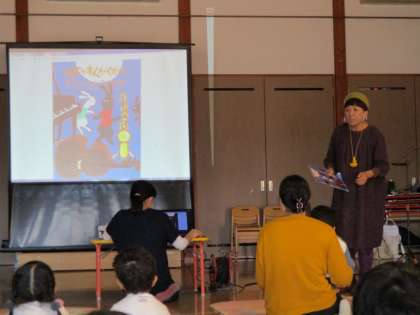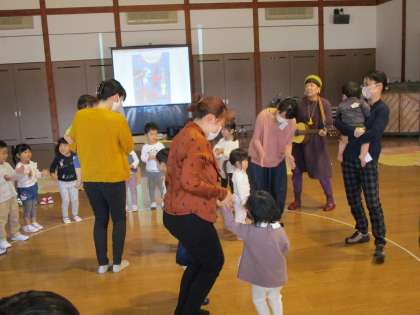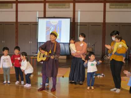 親子サークル 公開日 2020/10/20 更新日 2020/10/20 1日の生活 10月20日(火) 今日の親子サークルは、講師に酒井幸美先生を迎え、絵本の読み聞かせやお話に合わせて歌を聴いたりしました。一緒に参加した年少組と年中組の子供たちは、大きなスクリーンに映しだされた「つきよのおんがくかい」の絵本の絵を見て「映画館みたい」ととても嬉しそうでした。最後は、みんなでギターと歌に合わせて体を動かして楽しい時間になりました。