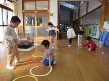 今日は昨日のトンボごっこが楽しかったようで、ステップカラーラバーリングを使って遊んでいた子がいました。どうやって並べたら楽しいか友達と相談したり、先生に「こうやって跳べるよ」と言ってカエルになって跳んだりしていました。子供たちなりに赤と青だけ使って跳ぶといったようなルールもあってなかなか難しいコースができていましたよ。