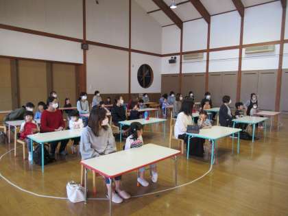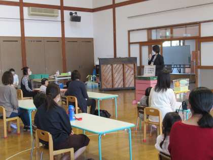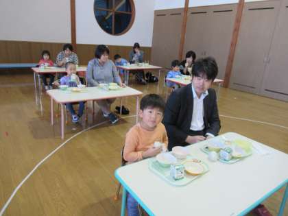 保育参観が終わり、その後はプレイルームに移動して、岡野栄養士さんからの給食クイズや配膳の仕方を教えていただきました。親子試食会が始まると、お家の方に普段の給食の量や味付けを知っていただく機会になり、子供たちも一緒に食べられてニコニコ笑顔でした。