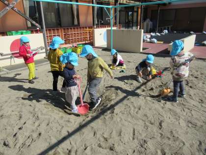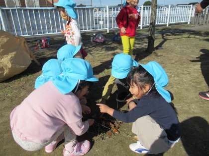 今日はピーターパン広場まで行ってかけっこをしたり、小枝を拾い集めてバーベキューごっこをしたり、砂場でもたくさん遊びました。バーベキューごっこでは肉や魚を焼いたり、焼きそばをつくったりする子もいてお腹いっぱいになりましたよ。