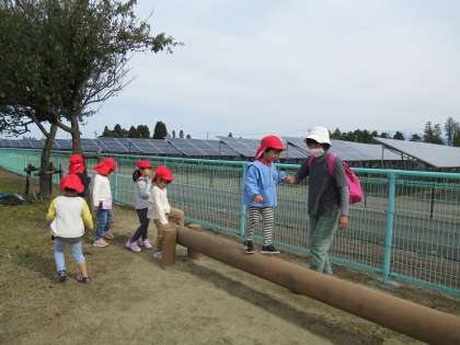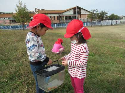 昨日捕まえてきたバッタの元気がなく「お腹が減ったんじゃない」「緑の葉っぱがいるね」と話し合い、ピーターパン広場に出かけました。いろいろな葉っぱの種類があり「これが美味しそうじゃない」「たくさん入れよう」と飼育ケースに入れ、眺めていました。みんなで大切に育てていこうと思っています。