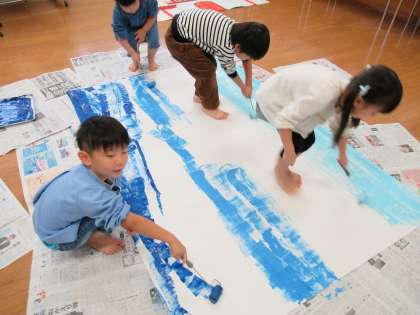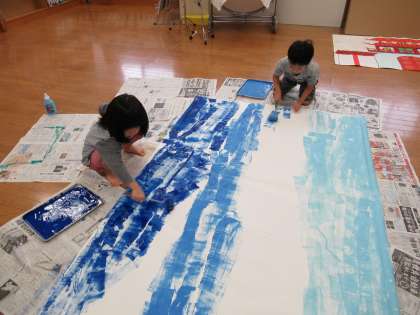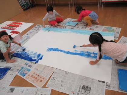劇の背景の色塗りをしました。(つばめ組) 公開日 2020/11/03 更新日 2020/11/03 1日の生活 11月2日(月) 今日は劇の背景になる海をみんなで色塗りしました。ローラーをコロコロ転がして段々と海になっていくのが嬉しく、夢中になって色塗りをしていました。劇に必要なものを自分たちでつくることを楽しんでいます。