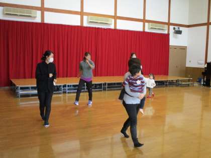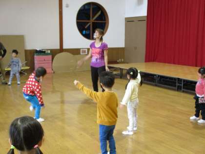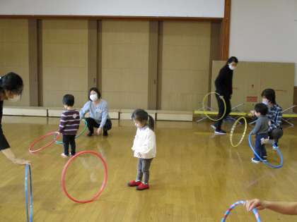 親子サークル 公開日 2020/11/04 更新日 2020/11/04 1日の生活 11月4日(水) 今日の親子サークルは、石川菜奈子先生と一緒に親子で体を動かして遊びました。音楽に合わせて歩いたり、フープを転がして取りに行ったり、“よーいどん!”で走ったりしました。途中からほし組の子供たちも仲間に入れてもらい、サザエさんの曲で踊りを教えてもらいました。みんなで一緒に体を動かして楽しい時間を過ごしました。