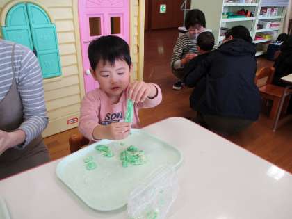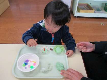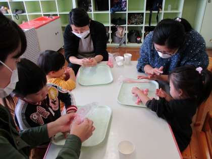 親子サークル 公開日 2020/11/10 更新日 2020/11/10 1日の生活 11月10日(火) 今日の親子サークルは、小麦粉粘土をしました。小麦粉に水や食紅を入れて、コネコネコネ・・・少しずつきれいな色になり、粉が固まっていきました。ピンクやきみどり色の小麦粉粘土をかわいいカップに入れて飾りをつけると、美味しそうなケーキができました。