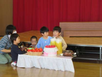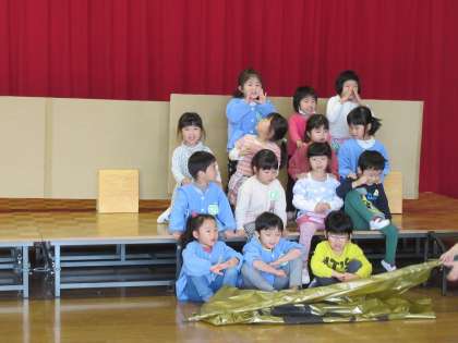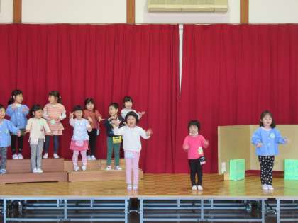 発表会でする劇や歌、合奏の活動をすることが増える一方で、自由遊びの時間には友達と一緒にままごとやレゴブロック、ウレタン積木を組み立ててのごっこ遊びとやり取りを楽しんでいます。今日もステージでの劇遊び。日に日に大きな声でセリフが言えるようになってきました。ほし組さんや周りで見ていた先生方にも褒められ、とても嬉しそうでした。
