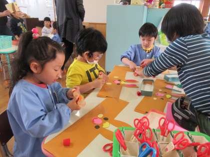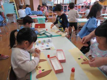自分で付ける動物のお面も目や鼻などをハサミで切り、のりで貼って仕上げました。