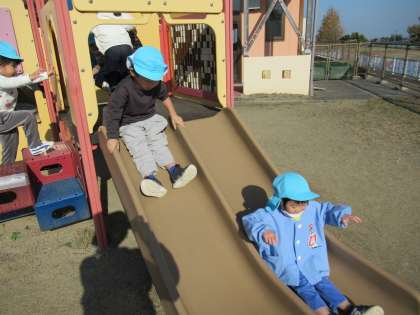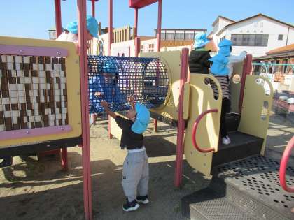 今日も天気が良かったので外で遊びました。みんなで滑り台を滑ったり、砂場で遊んだりしていると、恐竜になって遊ぶ子がいました。すると、アニメのキャラクターになって先生や友達を助ける子も出てきて、みんなで追いかけっこをして伸び伸び遊びました。