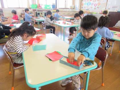 今日のたんぽぽ組 公開日 2020/11/17 更新日 2020/11/17 1日の生活 11月17日(火) 少し早いのですが、クリスマスの飾りづくりを始めました。今年度は、折り紙でリースをつくろうと思い、同じ折り方で16枚折りました。最初は先生と一緒に折り、次からは自分で考えてしていました。明日から少しずつ組み立てていきたいと思っています。園庭で遊んだり、親子サークルさんの音楽遊びに参加させてもらったりと楽しく一日を過ごしました。