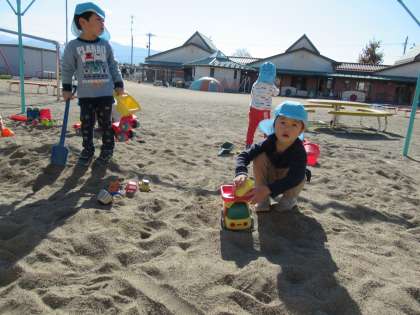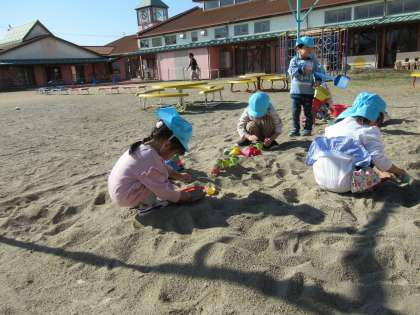 今日も砂遊びをしました。気持ちのいい風が吹く中、アイスクリーム屋さんになる子や、ポップコーンをつくる子がいて、いろいろな食べ物をつくっていました。ほし組さんも食欲の秋ですね。今日の食べ物にも当たりがあり、みんなで楽しそうに遊んでいましたよ。