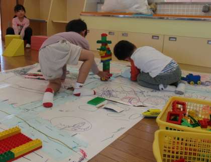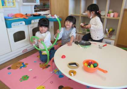 そして、午後からは伸び伸びと好きな遊びをしました。大好きな車やままごとで遊ぶ子や、カラー積み木を太鼓に見立てて遊ぶ子もいました。「ミックスジュース歌おう」「次はさんぽね」と発表会の曲を楽しそうに歌っていましたよ。