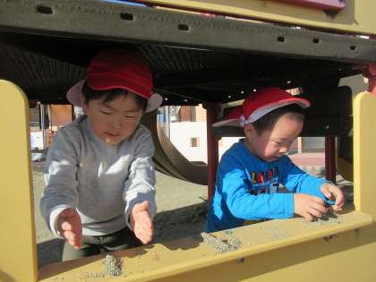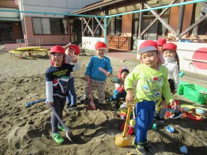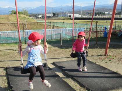 今日も元気なたんぽぽ組さん 公開日 2020/11/19 更新日 2020/11/19 1日の生活 11月19日(木) 発表会の劇遊びや歌・合奏を終え、年長組さんの鼓隊や劇を見せてもらった後、なかよし広場で遊びました。とても暖かくて、外で遊んでいるとじとっと汗ばむほどでした。遠くの山もよく見えて「雪が積もってるね」「きれいに見えるね」と眺めていました。かくれんぼや鉄棒、ブランコや砂遊びと友達や先生と一緒に楽しみました。