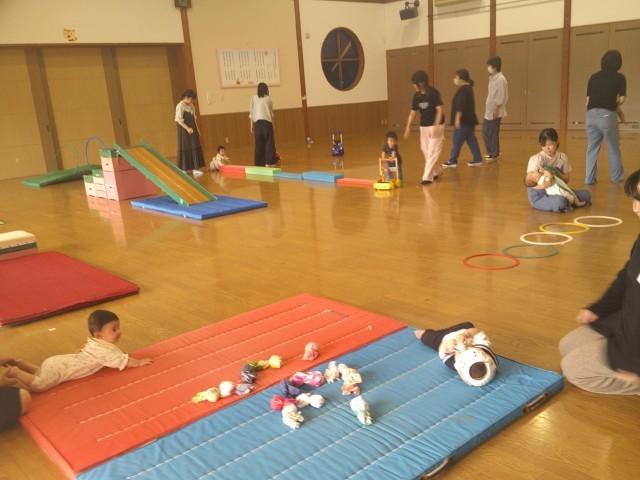 第2回目は「プレイルームで遊ぼう」ということで、なかよしルームでふれあい遊びをした後、プレイルームで体をいっぱい動かして遊びました。
