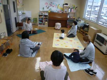 今日のサークルは、宮田 美里先生をお迎えして「親子でヨガ」をしました。