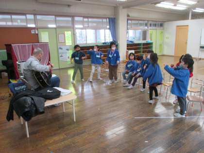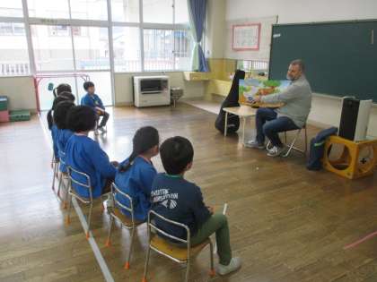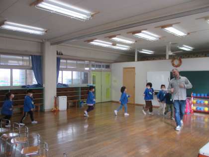 今日は、いろいろな乗り物の運転手を英語で教えてもらい、講師の先生の後に続いて、運転手になったつもりで、保育室の中をドライブしました。英語の歌を歌ったり、絵本を読んでもらったりした後にはお楽しみがありました。今人気の ♪炎♪ や ♪クリスマスソング♪ のギター演奏を披露してしださいました。みんなで一緒に歌ったり、踊ったりして楽しみました。