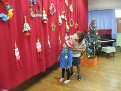 まずは、キャンドルセレモニー。5歳児が「思いやりの火」や「物を大切にする火」など、一人一人が大切な火を園長先生に灯してもらいました。続いて、学年ごとにつくったクリスマスの飾りを紹介しました。「星をつくってツリーに貼ったよ」「サツマイモのつるでつくったリースにマツボックリをボンドで付けたよ」など、代表の友達が話してくれました。
