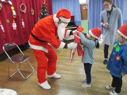そして、待ちに待ったサンタの登場!「コロナだからサンタさん来れるかな」と心配していたので、本物(?)のサンタさんを見ると大喜びの子供たちでした。クラスで考えた質問をしたり、プレゼントをもらったり、歌や踊りを披露したり、一緒に踊りを踊ったり...とても楽しい時間になりました。
