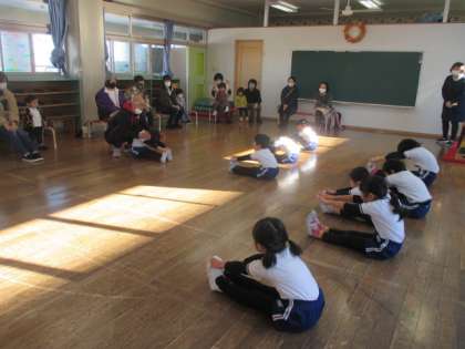 ♪ドラえもん♪の曲に合わせて準備体操をしました。みんながよく知っている曲なので、口づさみながら元気いっぱい体を動かしていました。次は、いよいよ今日の種目”跳び箱”です。手をしっかりつくこと、お尻がつっかえても、上に乗っかること、グーの足で踏み切ることなど気を付けることを実際に講師の先生がやりながら教えてくださいました。「よーし、がんばるぞ」と力が入ったり「ヤッターできた」と喜んだりする姿が見られました。お家の方が見ておられるのでちょっとドキドキしたり、気持ちが高まってしまう様子も見られましたが、指導を受けているところを見ていただくことができました。お忙しい中、ご参観いただきありがとうございました。