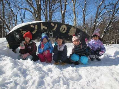 冬の国立立山青少年自然の家へ行ってきました。雪がたくさん積もっている立山へ行くことが初めてだった子供たちは、積雪量に圧倒され、目が真ん丸でしたよ。年中組の春に行ったときには、大きく高く見えたトントンの森の看板がすっぽり雪に埋もれていました。「トンネルみたいになってる!」「立ってみると、看板より大きくなった」と、大興奮の子供たちでした。野生のうさぎの足跡を見付けときには「(うさぎの足跡に沿って)進んでいったら会えるかな」と、目をキラキラにする姿も見られました。