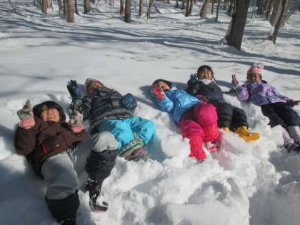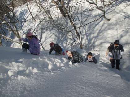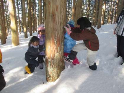 森へ入るなり「えっ、道が狭い!」「坂があるよ」と、戸惑いを隠せない子供たちでしたが、歩いて進んでいけないところはお尻で滑って進むよう教えてもらうと「滑り台より速く進む〜」「うわぁ〜!」と、大喜びで楽しんでいましたよ。大きな木を見付けると、5人でタイミングを合わせてキック!その反動で上から雪が落ちてくると、さらに歓声をあげていました。