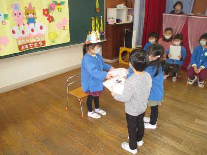 1月生まれの友達の誕生会をしました。インタビューコーナーで「好きなケーキは何ですか」と聞かれると「チョコケーキです」」と元気に答え、好きな友達からプレゼントをもらって嬉しそうでした。