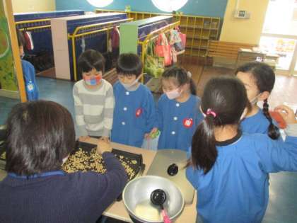 朝から香ばしい匂いがしてくると子供達は「何か焼けているような匂いがするよ」「豆がいっぱい!」と、園長先生が豆を煎っている姿を見付けて集まってきました。