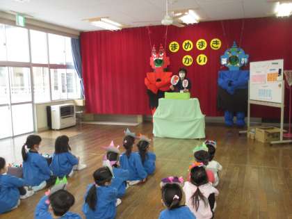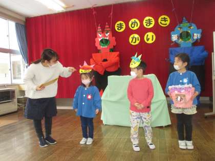 始めに、園長先生から節分の由来についてお話がありました。次に、自分のつくったお面と心の中の鬼を代表の友達が発表してくれました。