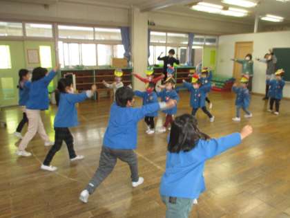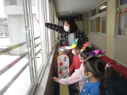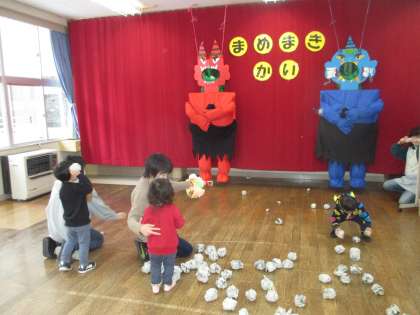 みんなで元気に♪鬼のパンツ♪を歌って踊った後には、先生が代表して窓から本物の豆をまきました。子供たちが「おには〜そと!おには〜そと!!」と、何回も声を出して応援しました。親子サークルの友達も一緒に参加し、大きな赤鬼と青鬼に向かって豆ボールを投げました。始めはドキドキで鬼に近づくのもやっとでしたが、だんだん慣れてくると、泣くこともなく豆ボールを投げる姿が可愛らしかったです。