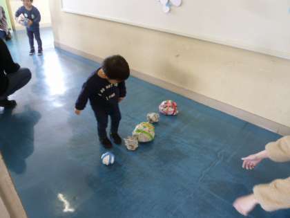 今日のサークルでは、新聞紙にお絵かきをして丸めて丸めて・・・ボールにして遊んだり、傘用ナイロン袋を膨らませてながーい風船みたいにして遊んだりしました。