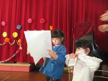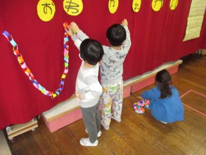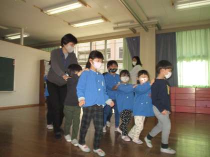 たんぽぽ・ひまわり組では、たくさん遊んだり、お世話をしたりしてくれたうさぎ組さんにありがとうの気持ちを込めて、お別れ会の準備を進めてきました。みんなでわくわくルームを飾りつけし、うさぎ組さんを招待しました。ひまわり組が進行を担当して『フルーツバスケット』『貨物列車』『間違い探し』などのゲーム遊びをみんなでしたり、出し物のダンスを披露したりして、うさぎ組さんに楽しんでもらいました。