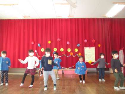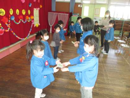 最後に、プレゼント交換をしました。たんぽぽ組からは『首飾り』、ひまわり組からは『写真立て』をうさぎ組さんに送りました。「かわいい、ありがとう」「楽しかったよ」と喜んでもらい嬉しかったです。うさぎ組さんからは、お礼に『プラ板のキーホルダー』をもらい、たんぽぽ・ひまわり組も喜んでいました。