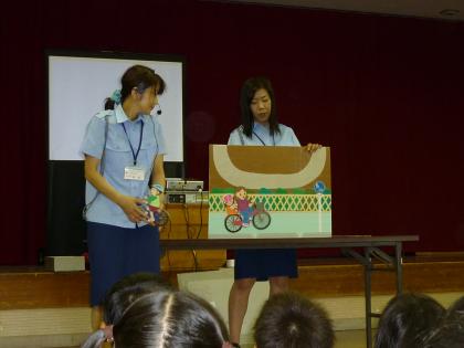 9月3日(金)交通安全教室があり、4.5歳児が参加しました。交通安全教室では指導員の方に横断歩道の渡り方、信号機の見方、自転車に乗るときは、ヘルメットをかぶることなど子供達にわかりやすい紙芝居で教えていただきました。また、「孫悟空」のビデオを通して交通ルールを楽しく学びました。