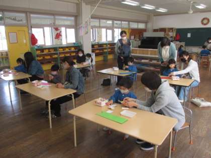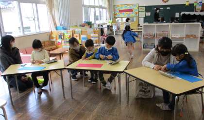 こいのぼり製作では、4歳児は切り紙、5歳児は編み込みで素敵な鱗をつくりました。「かわいい形になったね」「色の組み合わせ素敵!」と褒められて最後まで頑張ってつくることができました。
