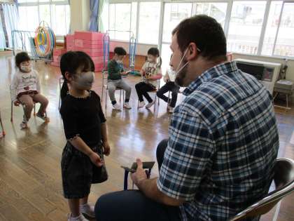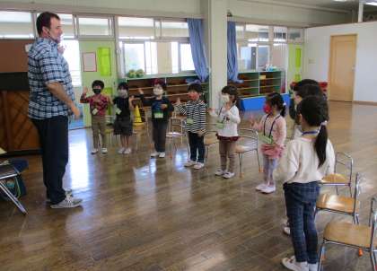 先日、今年度最初のハロータイムがありました。初めて参加したひまわり組は「ハロー!」と登場されたテリー先生に少し圧倒された様子が見られましたが、一人ずつ英語で書かれた自分の名札をもらう時には「サンキュー」と上手に言えていましたよ。