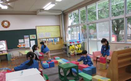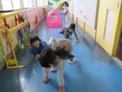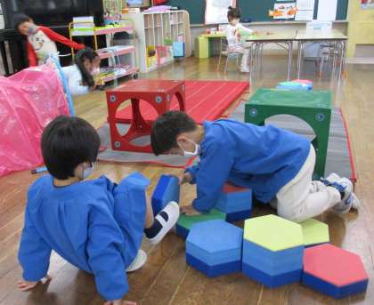 『へんしんトンネル』の絵本が大好きな子供たち。「オタマジャクシからカエルになるよ!」と、トンネルの中ではオタマジャクシに、トンネルを出るとカエルに変身する遊びが始まりました。「池もつくりたいな」「クネクネの道もつくりたい!」と、トンネルだけでなく、いろいろな遊びのアイディアが出てきています。