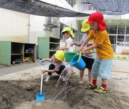 先日から、子供たちと砂場を掘ってつくってきた大きな池に水を溜めて遊びました。