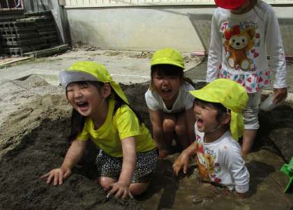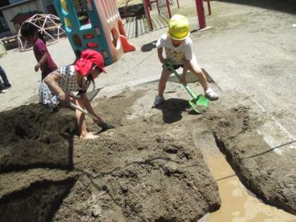 水を溜めたところへ「お風呂だ〜!」と言って浸かると「きゃ〜!!」と大盛り上がり!「もっと深くしたい」と、バケツで水を運んで深い池づくりが始まりました。