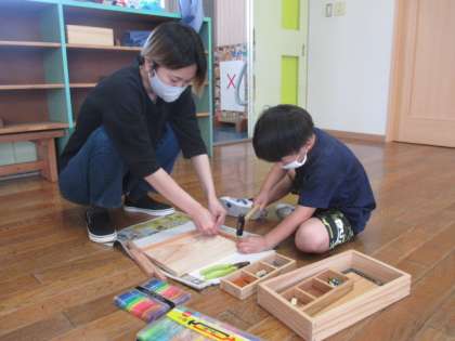 トンカチで指をつぶさないように保護者の方に支えてもらって、恐る恐る釘を打ってみたり、ビー玉が転がるところに小さな木片をつけてプロペラのようにしたりして、親子で楽しく工夫しながらオリジナルのビー玉転がしを完成させました。