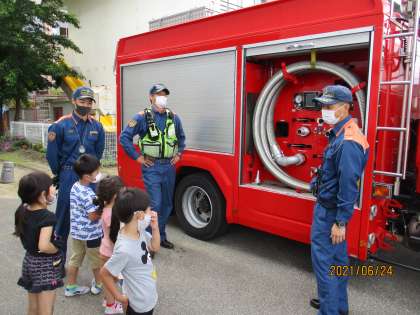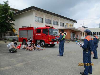 今回は、消防署の方の指導をいただき、火災を想定した訓練を行いました。ベルが鳴ると、子供たちの表情も真剣になり、放送をよく聞いて、避難することができました。『お(押さない)・は(走らない)・し(しゃべらない)・も(戻らない)』の約束を守って避難することの大切さを再確認し、今後も安全に避難できるよう取り組んでいきたいと思います。