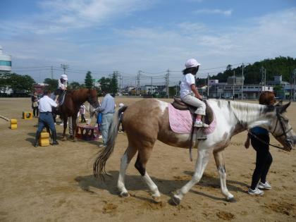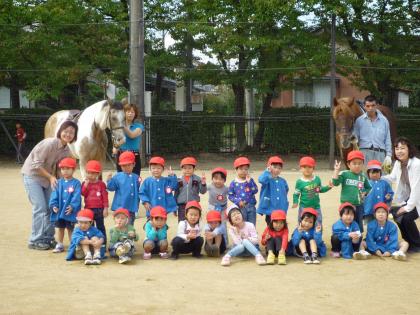 10月5日(火)ふたば会主催の「馬と触れ合おう」がありました。デモンストレーションでは、障害物をジャンプするところや、「とまれ」の指示に馬が止まるなど見せていただきました。年長は乗馬の体験をしました。初めは怖がっていた子も馬に乗ってしまうとにこにこ笑顔になりました。年中・年少は馬に触れたり、人参を手渡しであげたりしました。真近でみる馬はとても迫力があり、大興奮の子ども達でした。
