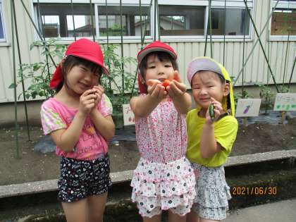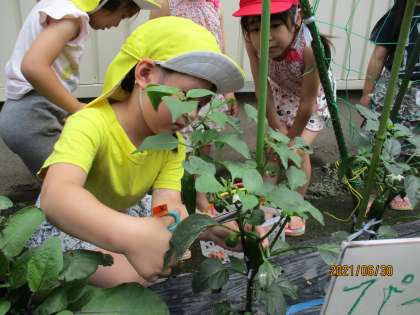 昨日は1つしか赤くなっていなかったミニトマトが、今日は4つも赤くなっていて嬉しかったね。収穫した野菜は家へ持って帰って食べることにしています。どんな料理にして食べたか、どんな味だったかの報告を楽しみにしています♪