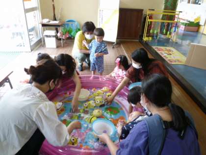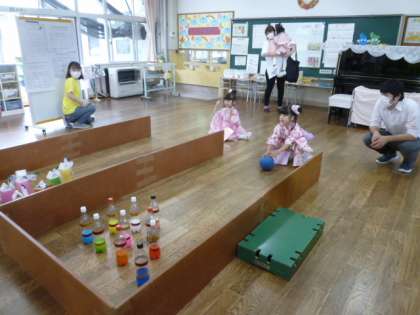 スーパーボールすくい、風鈴づくり、ボーリングなど、いろいろなコーナーをお母さんやお父さんと回り「キラキラ光るお魚が釣れたよ!」「(ボーリングのピン)11本倒せた」などなど、喜びの報告がたくさん聞かれました。