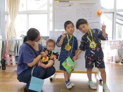 今日は待ちに待った夏祭り!いつもと違い、可愛い浴衣やかっこいい甚平姿で登園してきた子供たちは少し照れながらも、ニコニコ笑顔でしたね♪