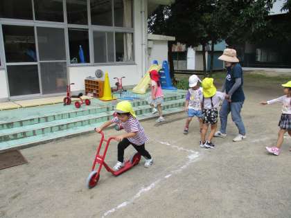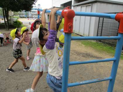 園庭でも元気に体を動かしています!ケンパの丸を描いて遊んだり、キックボードや三輪車に乗ったりして楽しんでいましたよ。雲梯では、端から端まで渡り切れるように頑張る姿も見られました。