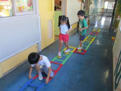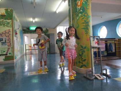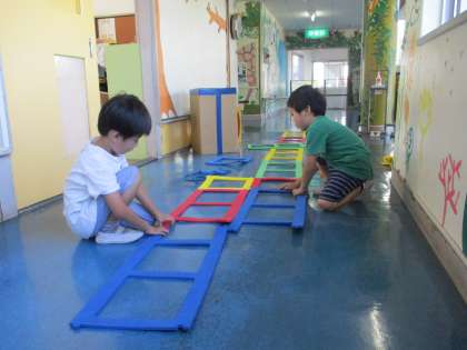 4歳児ひまわり組は、運動会のプレゼントに保護者会から「パカポコ」をいただきました。乗り始めたころは、足をのせるバランスをとるのが難しかったけれど、上手く歩けるようになると、その音も面白いようで、友達を誘って楽しんでいます。「道をつくって歩いてみよう」と、ソフトラダー(梯子型マット)をつなげると、早速、その上を歩いていました。「曲がり角もあったらおもしろいよね」と友達と相談しながら、長い道を「パカポコ、パカポコ…」と言いながら何度も挑戦していました。