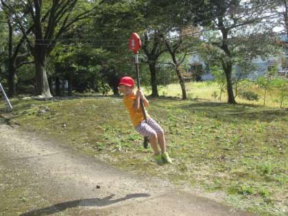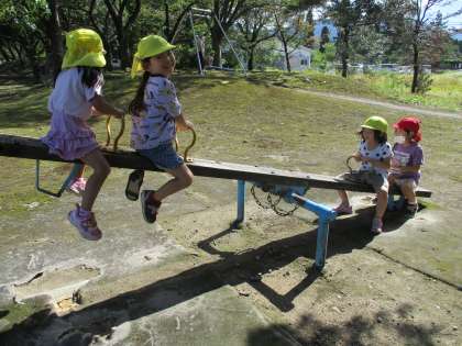 公園では、ブランコやシーソー、ターザンロープで遊んだり、ドングリ探しをしたりしました。シーソーでは「そっち重すぎ!」と、沈んだままになってしまったり、ドングリ探しでは、「幼稚園のドングリより小さいね」といくつも拾ったりして、喜んでいました。